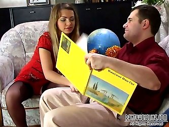 Misbehaving blonde coed in grey pantyhose surrenders to suck-n-fuck lesson