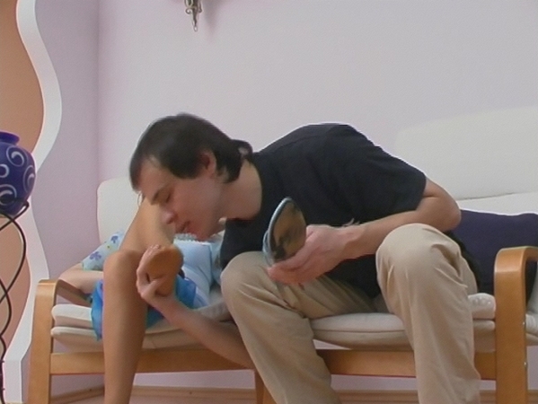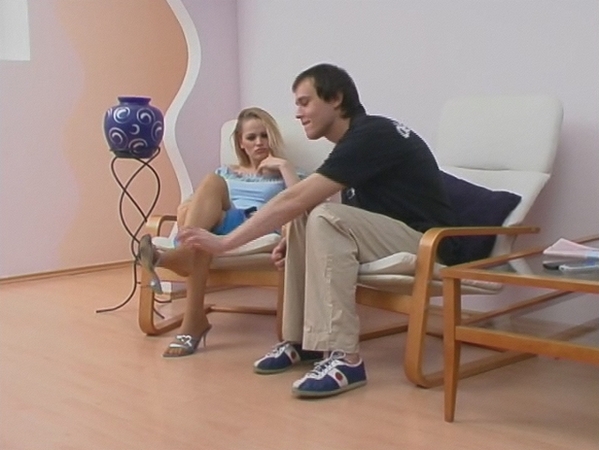 Nasty chick getting her pantyhosed legs worshipped before giving footjob